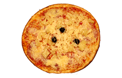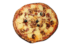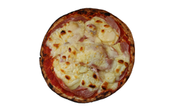 Sauce tomate, jambon blanc, ananas, olives, fromage râpé.