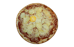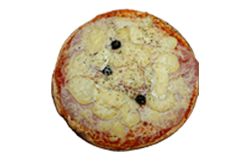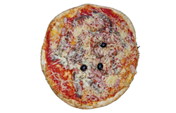Sauce tomate, jambon blanc, pommes de terre, camembert, olives, fromage râpé, origan.