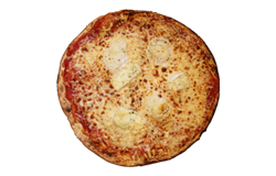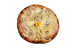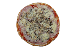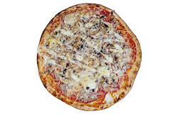 Sauce tomate, jambon blanc, champignons, fromage râpé, origan.