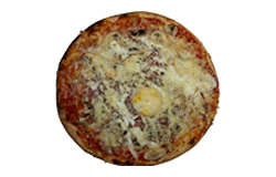 Sauce tomate, lardons, oeuf, crème fraîche, mozzarella, origan.