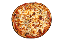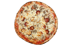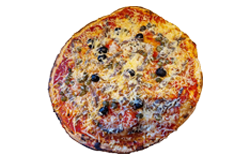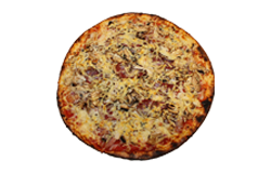Sauce tomate, oignons, poivrons, champignons, lardons, merguez, chorizo, olives, fromage râpé, origan.
