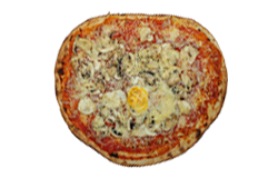 Sauce tomate, jambon blanc, champignons, oeuf, camembert, crème fraîche, fromage râpé, origan.