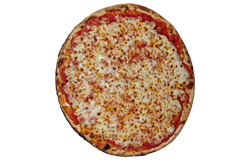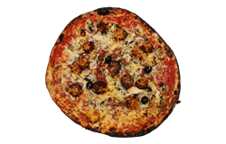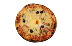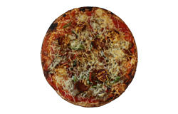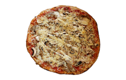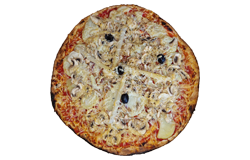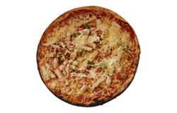 Sauce tomate, blanc de poulet, poivrons, olives, fromage râpé, origan.