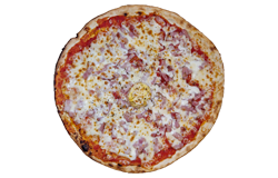 Sauce tomate, jambon blanc, oeuf, mozzarella, origan.