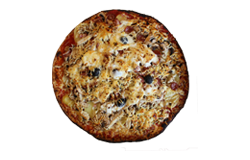 Sauce tomate, lardons, jambon, champignons, merguez, oeuf, crème fraîche, mozzarella, origan.